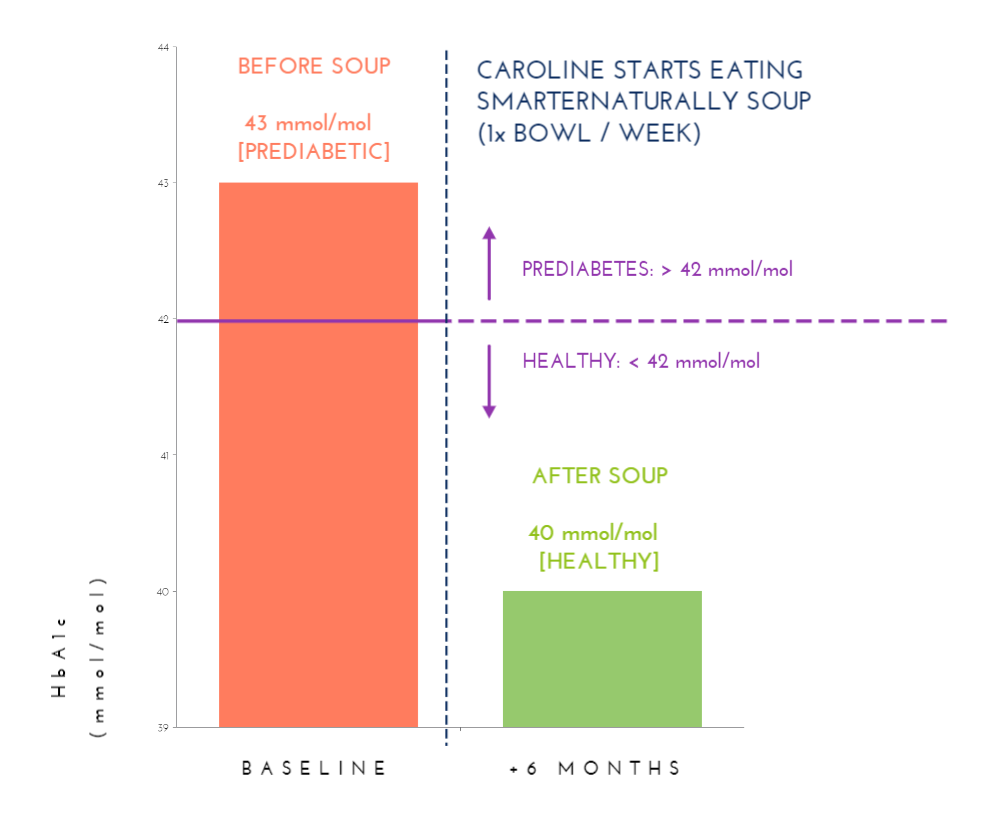 Then she discovered SmarterNaturally SuperSoup. After just 5 months of eating one bowl a week, her blood sugar levels have dropped dramatically, meaning she was no longer prediabetic – much to the surprise of her GP!
